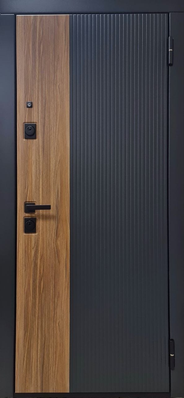 Отделка снаружи: МДФ 10 мм, покрытие PVC: экошагрень черная (MD40) + декор. черный молдинг + декор. вставка из МДФ